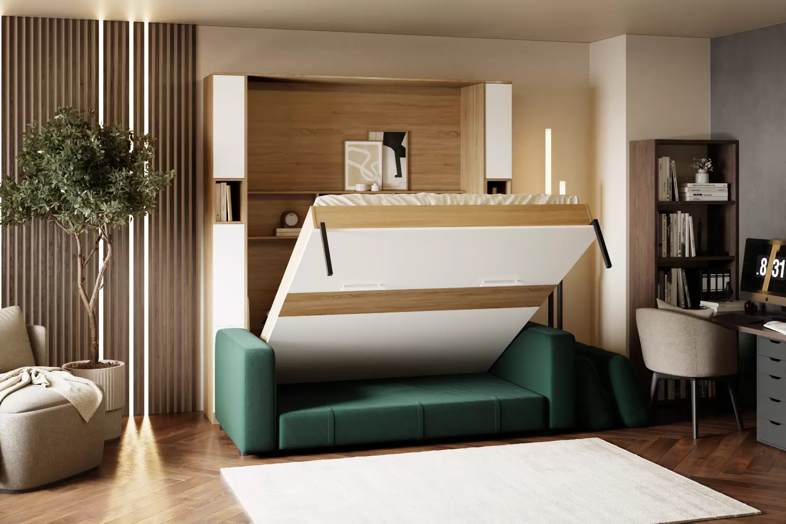 Шкаф-кровать "Modern Start" работает на механизме раскладывания собственной разработки "Start". Кровать раскладывается легким движением руки, превращаясь в полноценное спальное место. Просто потяните ее за ручки, расположенные на фасаде и выставите ножки-опоры.